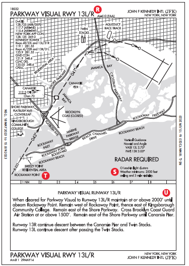 Parkway Visual starts at or above 2000 feet MSL. [U] It requires a familiarity with the various visual references starting abeam Rockaway Point, then Kinsborough Community College, along the Shore Parkway, near the closed Brooklyn Coast Guard Air Station, then Canarsie Pier (not the Canarsie VOR), followed by the Old Mill Creek lead-in lights. Overfly the other relevant lead-in lights of the Canarsie approach to the landing runway. The Canarsie VOR provides additional course guidance (radials 223-degree inbound and 041-degree outbound). The ground track is similar to the Canarsie Approach.