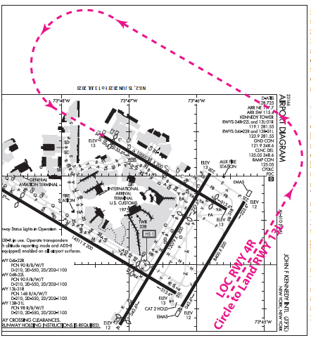 A major airline took the initiative to develop and adopt the Canarsie Approach. Before the approach, when the winds favored the southeast-facing runways (13 L & R), the procedure was to fly the 4R LOC to a CTL MDA of around 700-800 feet MSL (about the same AGL). Fly the length of Runway 4R, then a left turn to a left downwind to Runway 13L, followed by a 180-degree left turn to Runway 13L. With the higher jet approach speeds, the CTL maneuver with a change in direction of 270 degrees resulted in a somewhat sporty experience, especially in marginal weather conditions. Noise consideration was another critical factor in adopting the Canarsie Approach since it minimizes the footprint over built-up areas compared to straight-in approaches to Runways 13L and 13R.
