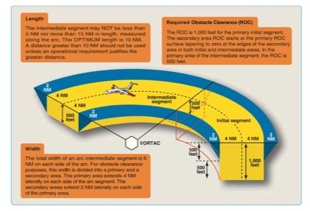 A DME arc is a curved track at a constant distance around a facility that offers omnidirectional course information and DME, such as a VORTAC, VOR/DME or NDB/DME. This eliminates ILS or LOC DMEs. An arc’s radius is 7- 30 NM and is 5-15 NM long, with 10 NM preferred. Thus, arcs can be lengthy and inefficient. The primary area required obstacle clearance is 1000 feet within four NM of the arc along the initial segment, with a 500-foot secondary clearance extending another two NM. In the intermediate segment, the clearance drops to 500 feet.