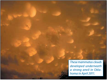 Often you will see mammatus, which are rounded bumps on the underside of the anvil cloud that look like udders. Flight training material from the 1970s used to refer to this as a sign of tornadoes and severe weather, but this is now known to be a myth. Mammatus does tend to correlate with well-developed thunderstorms producing large amounts of ice crystals and probably an environment with moderate shear, but it sometimes also develops in benign weather conditions. Enjoy the view and take a few pictures if you can.