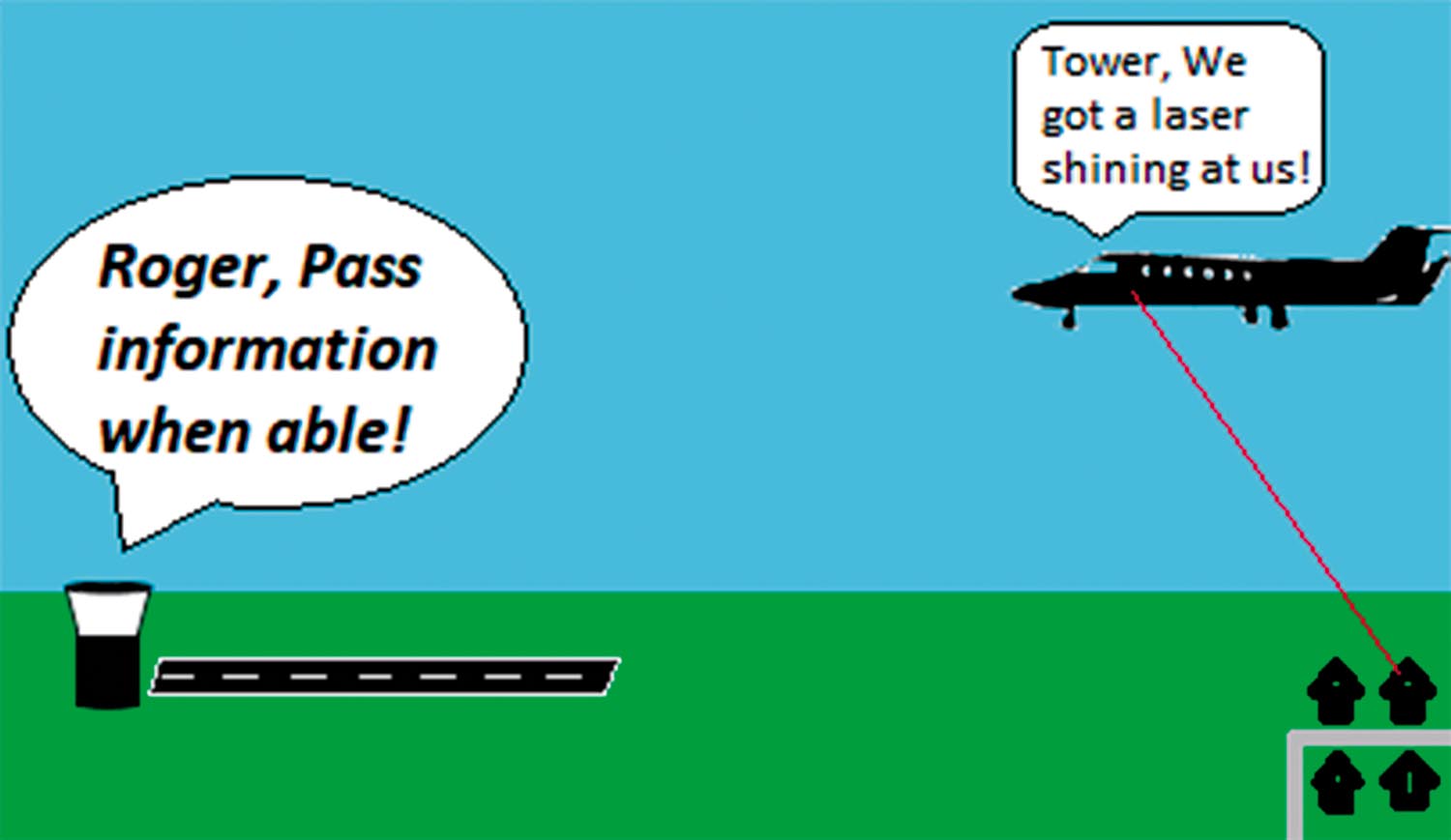 With nothing else going on, I give him a few moments, then said, “Falcon 12345, Runway 36 cleared to land. Everything okay?” A different voice from first responded, “Falcon 12345 just got hit with a laser off our right side, uhh, it was green, co-pilot having a hard time seeing.” Of course, I asked if he needed assistance, but with him being on about a three-mile final (critical phase of flight), he simply said, “No, uhh, landing.”